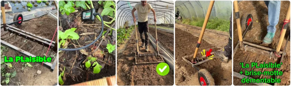 Entre ceux qui bêchent pour enfouir le fumier, ceux qui passent le motoculteur avec charrue et rotavator pour préparer vite le potager, et les adeptes d’un léger passage de grelinette, il y a beaucoup de nuances possibles. La PLaisible + brise-motte apporte l’efficacité et l’ergonomie.
